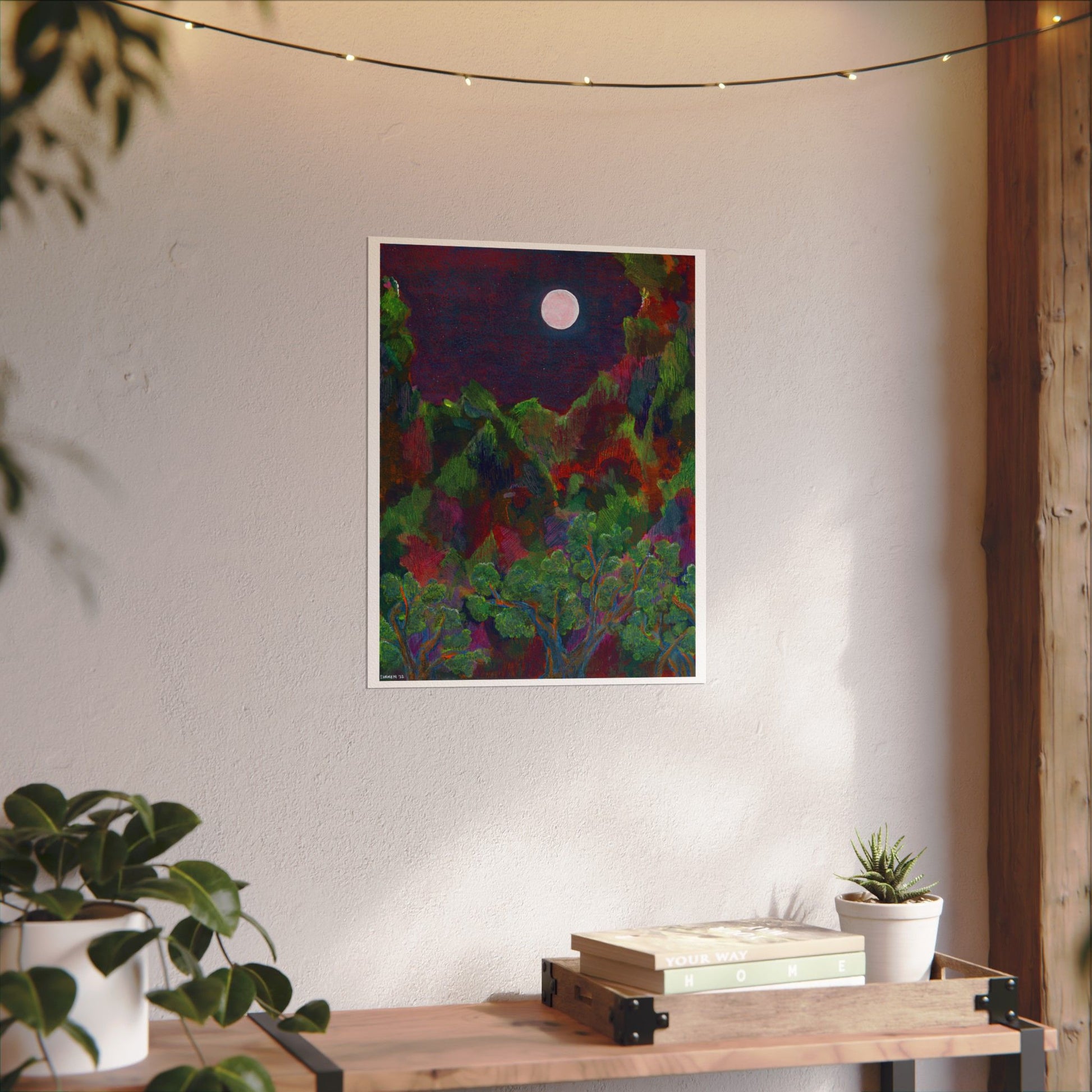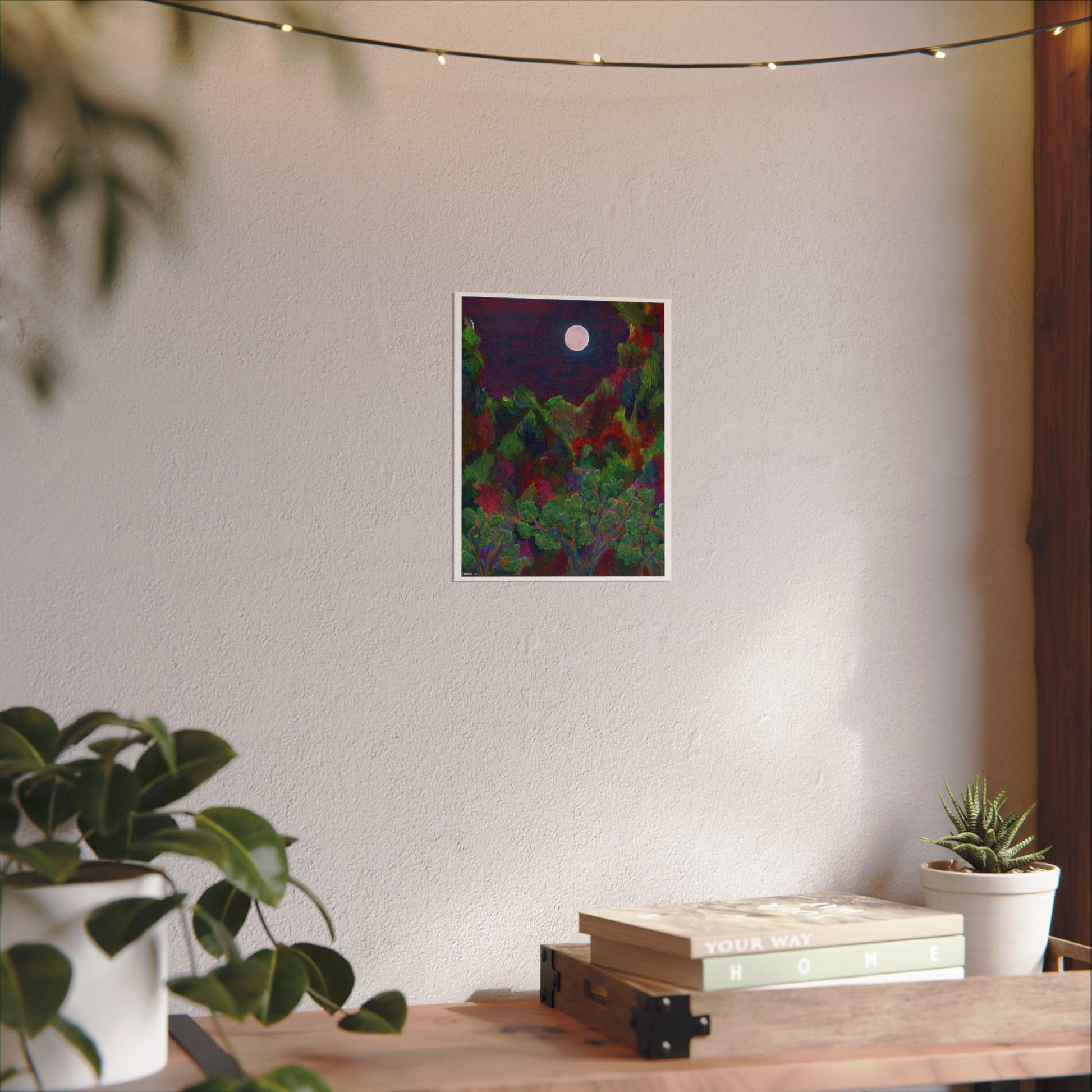 The deep dark sky appears over a technicolor mountain range in this vibrant, textured matte art print while a cheeky full moon makes the cypress trees glow. The original acrylic painting hangs in my dining room, and the orange underpainting in the sky glows in the afternoon sun.